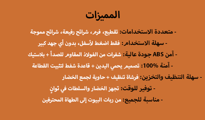 • شفرات فولاذية حادة لسرعة ودقة في التقطيع.